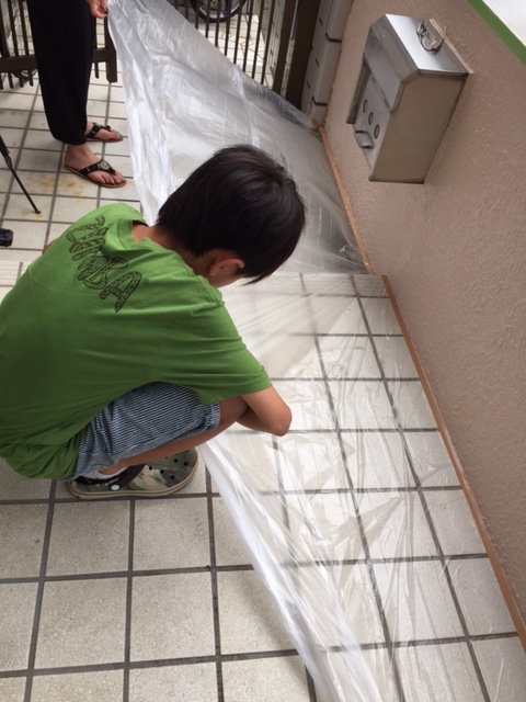 工事もほとんど終わり、最後塀の上部を、職人さん立ち合いのもと子供に塗らせてもらいました。
